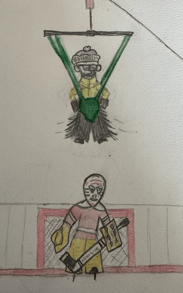 Gary and I explained that the ladder and platform were a step up from the old days, when the goal judge would actually be strapped into a harness—much like a baby’s Jolly Jumper—and hoisted above the net using a rope and pulley system. The rope would then be tied off to a large cleat to secure the dangling judge in place. A “rink rat” (a boy who scraped ice and did odd jobs in exchange for free ice time) was tasked with raising and lowering the judge before and after each period.