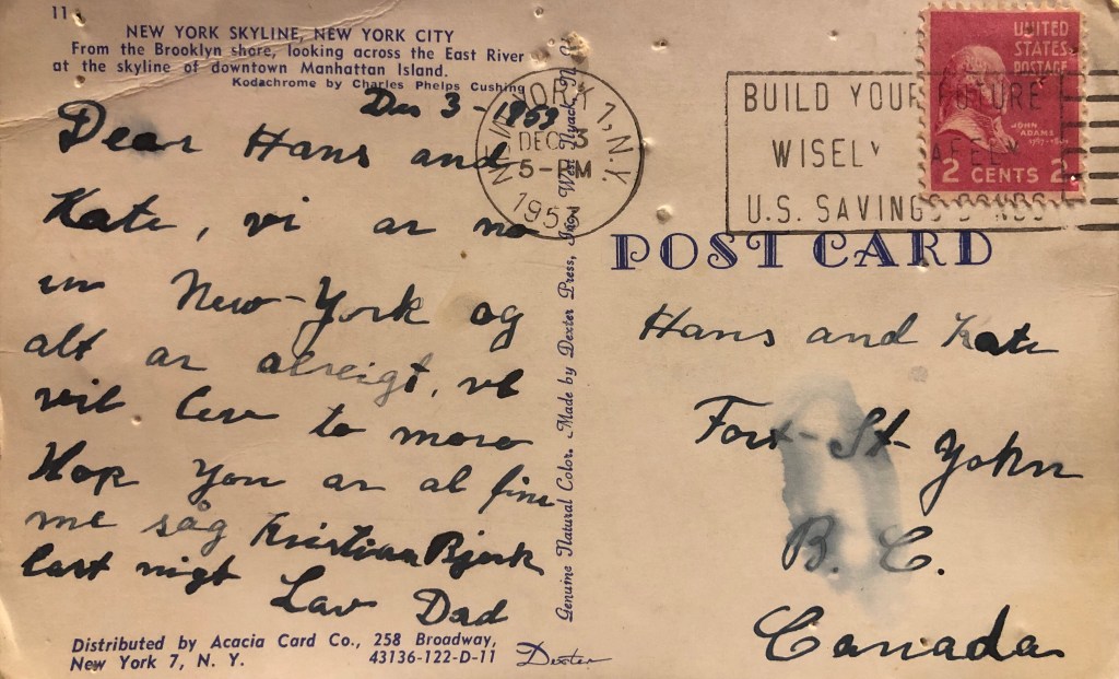 Grampa sent the post card from New York City in December of 1953. He was en route to Norway for the first time since coming to Canada in 1929.